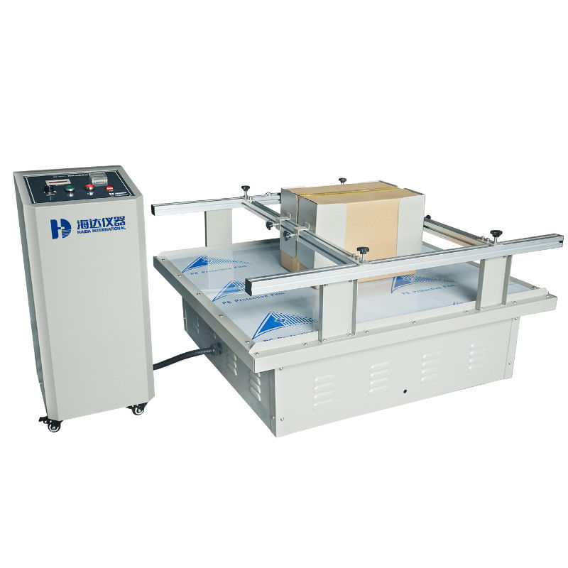 تستند آلة اختبار الاهتزاز في محاكاة النقل إلى معايير النقل الأمريكية والأوروبية ، مع الإشارة إلى الولايات المتحدة من معدات مماثلة لتحسين التصنيع.استخدام محامل غريبة في مسارات بيضاوية دوارة تم إنشاؤها لمحاكاة سيارة أو شحن البضائع أثناء النقل الاهتزاز من الاصطدام. سيتم تثبيت منصة الاختبار على محمل غريب المركز ، عندما تدور محمل غريب المركز ،منصة الاختبار للطائرة بأكملها ستنتج حركة فوقية وأسفل أمامية وخلفية على شكل بيضاوي، ضبط العمود الغريب مع سرعة الدوران يعادل ضبط سرعة المركبات أو السفن.
